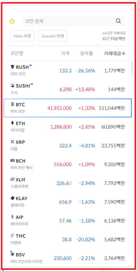 처음 암호화폐 거래를 하시는 분들은 Main마켓을 클릭하여