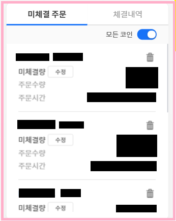 완료된 주문이 [미체결 주문] 내역에 생깁니다.