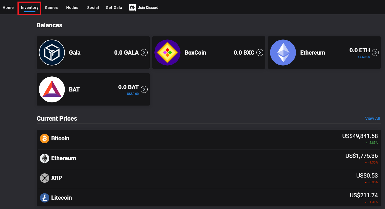 지갑 생성이 잘 되었는지 보기 위해 위의 버튼을 클릭하거나 Inventory를 클릭하면 아래와 같은 화면이 나옵니다.