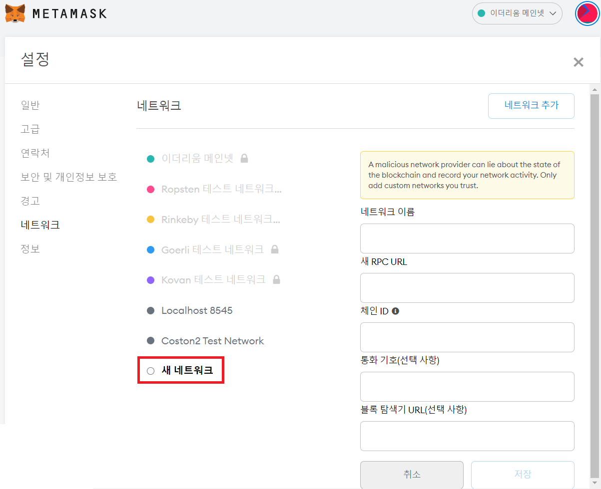 이제 메타마스크에 커스텀 네트워크를 추가할 수 있습니다.