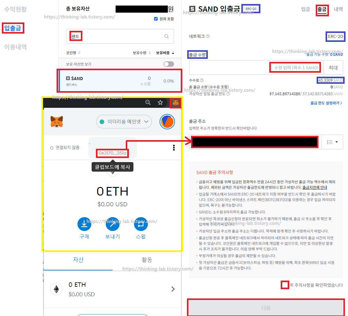 출금 주소에는 메타마스크 지갑 입금 주소를