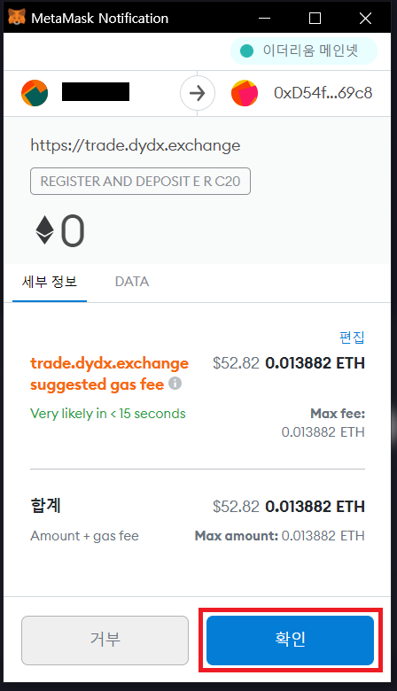 다시 한번 메타마스크 지갑 서명 창이 뜨고