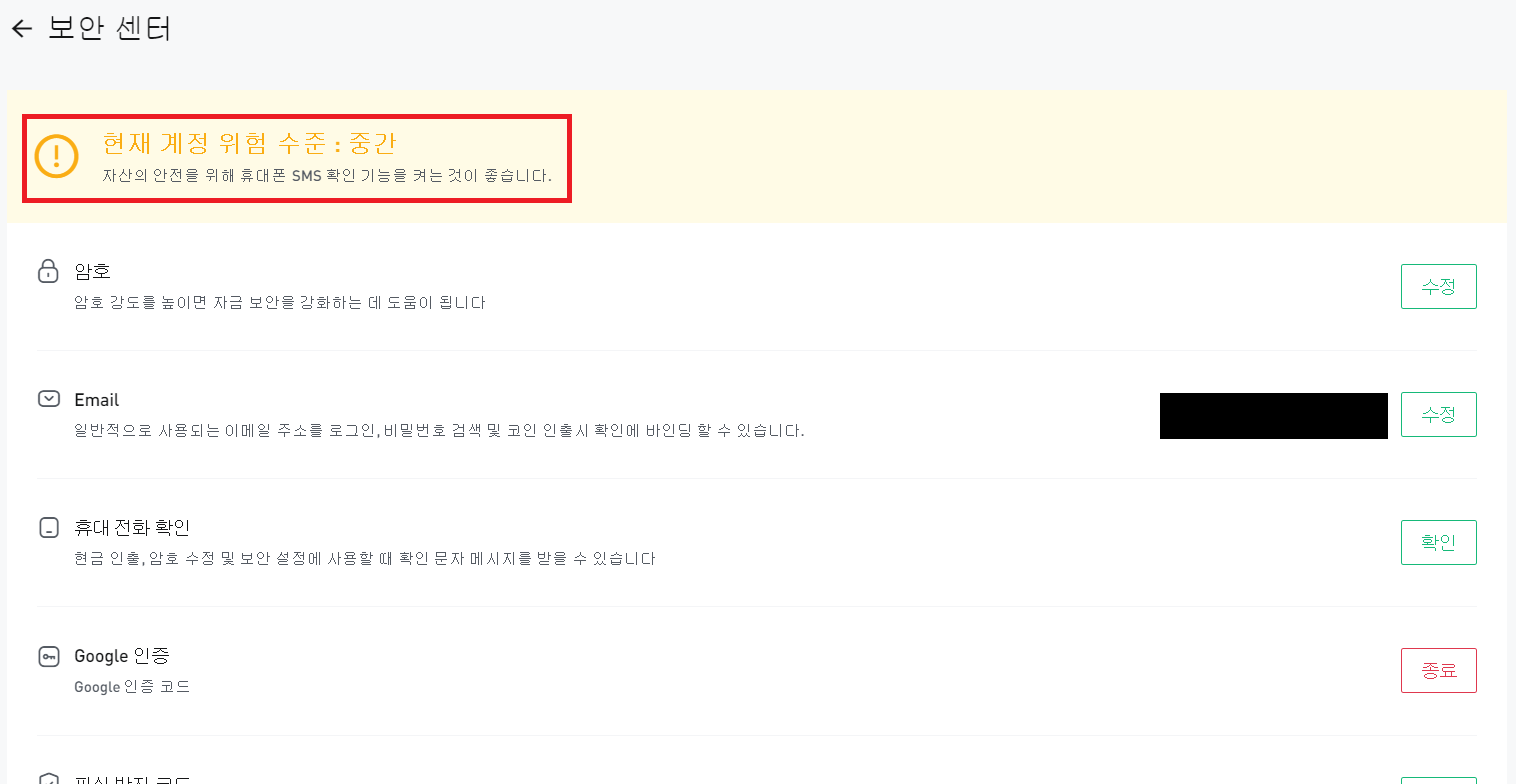 이렇게 MEXC 보안 수준이 중간으로 바뀌고