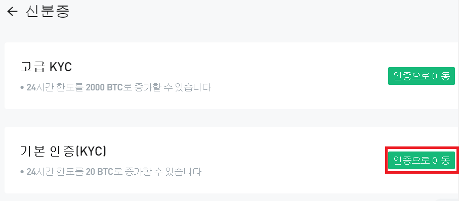 기본 인증(KYC)의 [ 인증으로 이동 클릭 ]