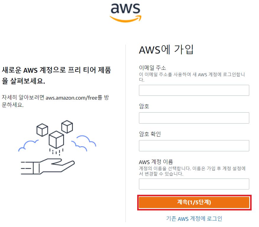 AWS에 이메일 주소, 암호, 이름을 입력 후