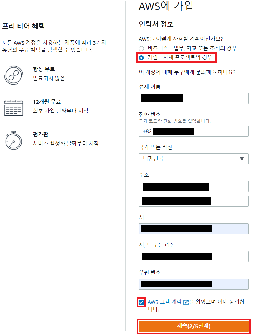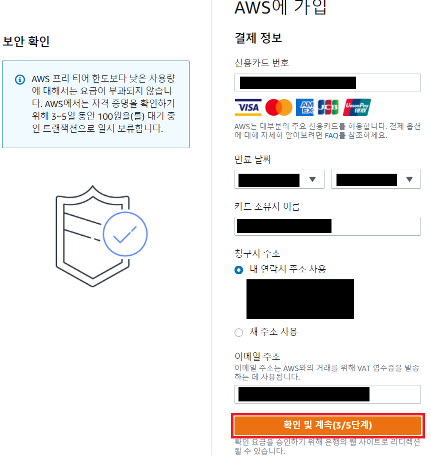 [ 확인 및 계속(3/5단계) 클릭 ]