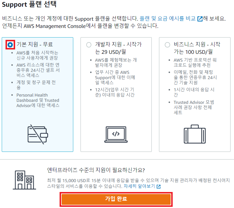 AWS 서포트 플랜 선택창이 나옵니다.