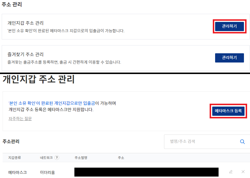 업비트는 메타마스크 개인지갑만 허용합니다.