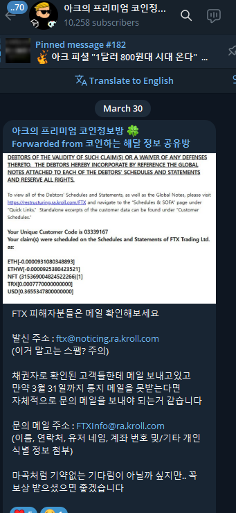 위 메일에서 FTX 채권자로 확인된 고객들에게 메일을 보냈었습니다.