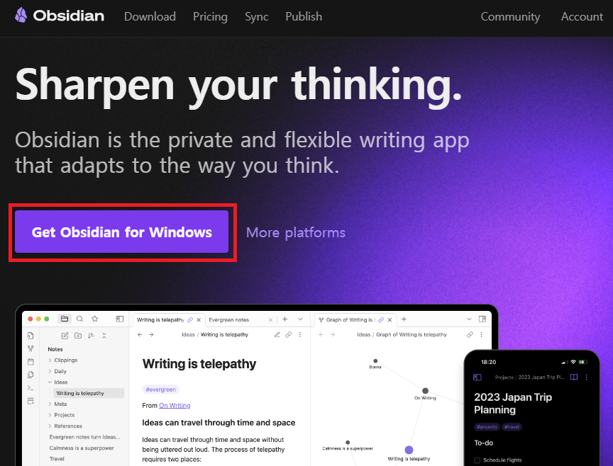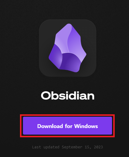 설치를 위해 옵시디언 공식 사이트 접속 후 [ Get Obsidian for windows 클릭 ]