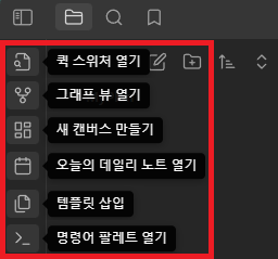 - 퀵 스위처 열기 : 빠르게 새로운 파일(노트)을 생성하거나 열 수 있습니다.