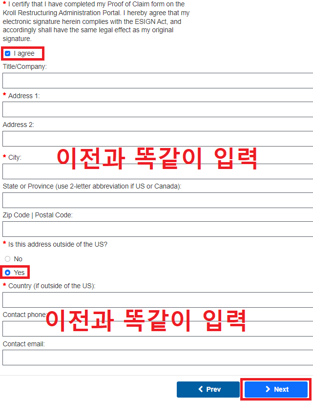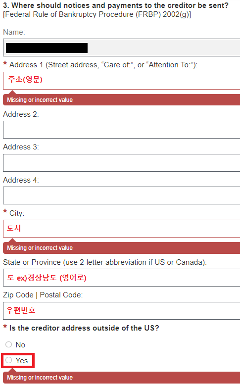 Is the creditor address outside of the US? : 채권자 주소가 미국 이외의 지역입니까?라는 질문에는 Yes를 클릭